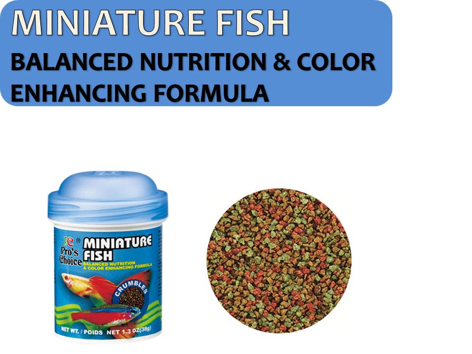Pro’s Choice® Miniature Fish-Crumbles Rich granules in three different colors provide a nutritionally balanced food for mini-tropical fish, as essential to healthy growth and color enhancement. An ideal food for surface and mid-water feeding does not cloud the water if fed properly.