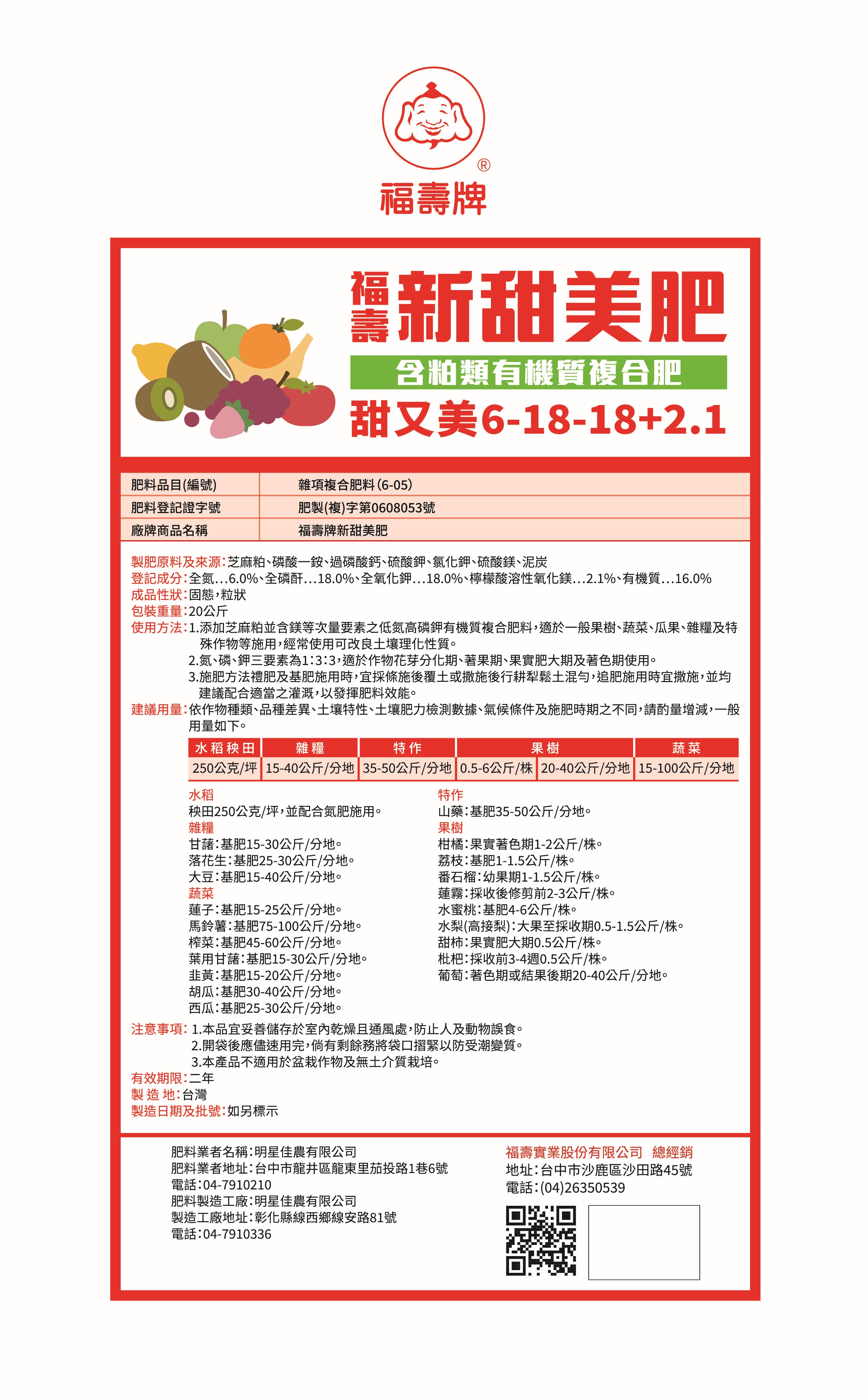 - 添加芝麻粕並含鎂等次量要素之低氮高憐鉀有機質複合肥料,適於一般果樹、蔬菜、瓜果、雜糧及特殊作物等施用,經常使用可改良土壤理化性質。