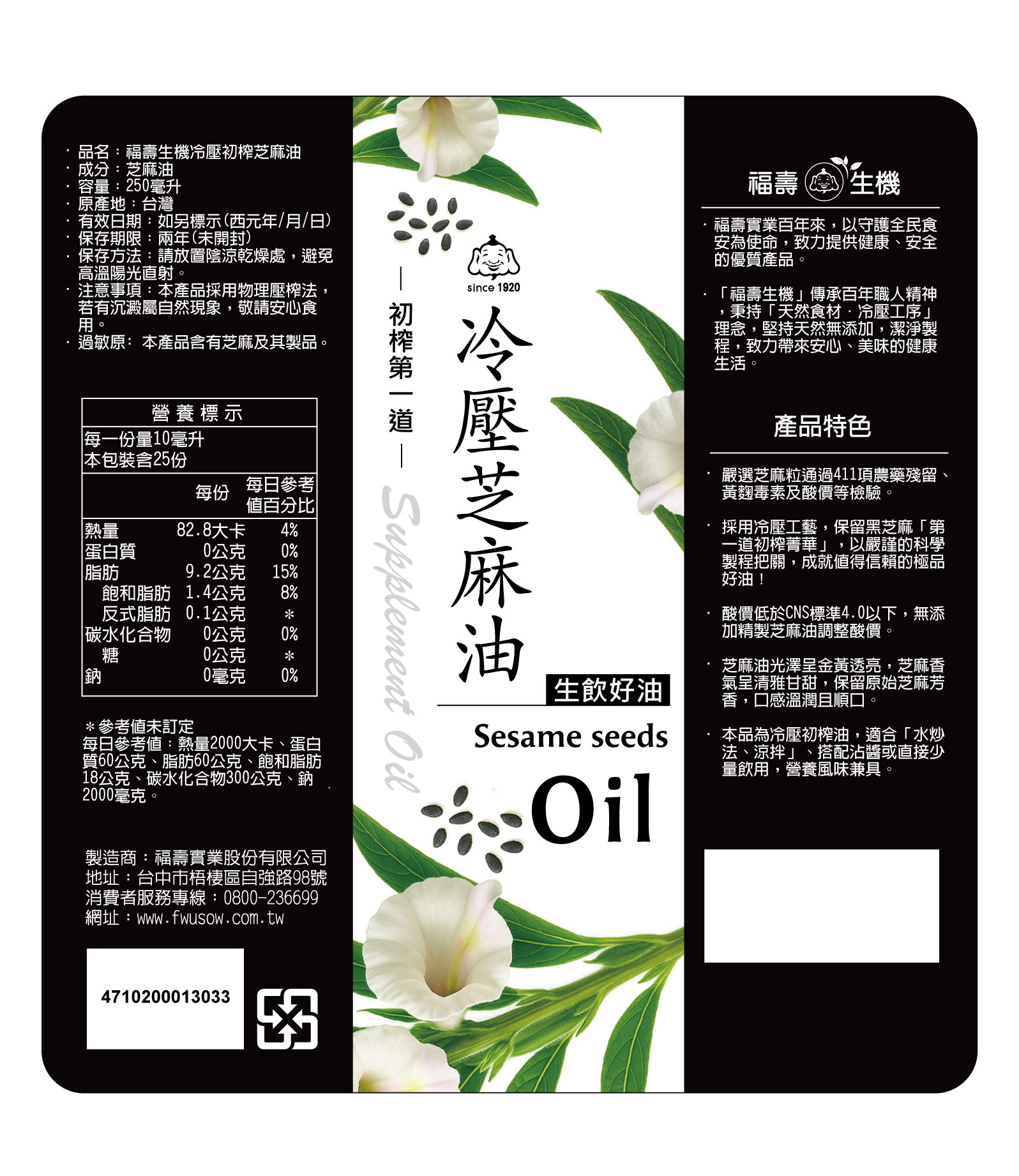 .冷壓初榨製法|避免高溫破壞營養,完整保留芝麻天然成分 .純粹天然風味|金黃油色、濃郁芝麻香,口感溫潤順口 .安心品質把關|通過 CNS 檢驗 4.0L以下,無添加人工香料與化學成分 .多元使用更便利|適合涼拌、水炒、低溫烹調,也能少量直接飲用